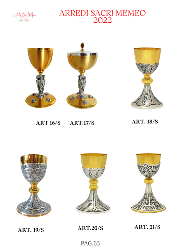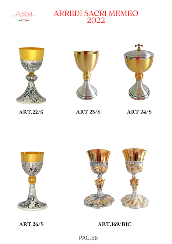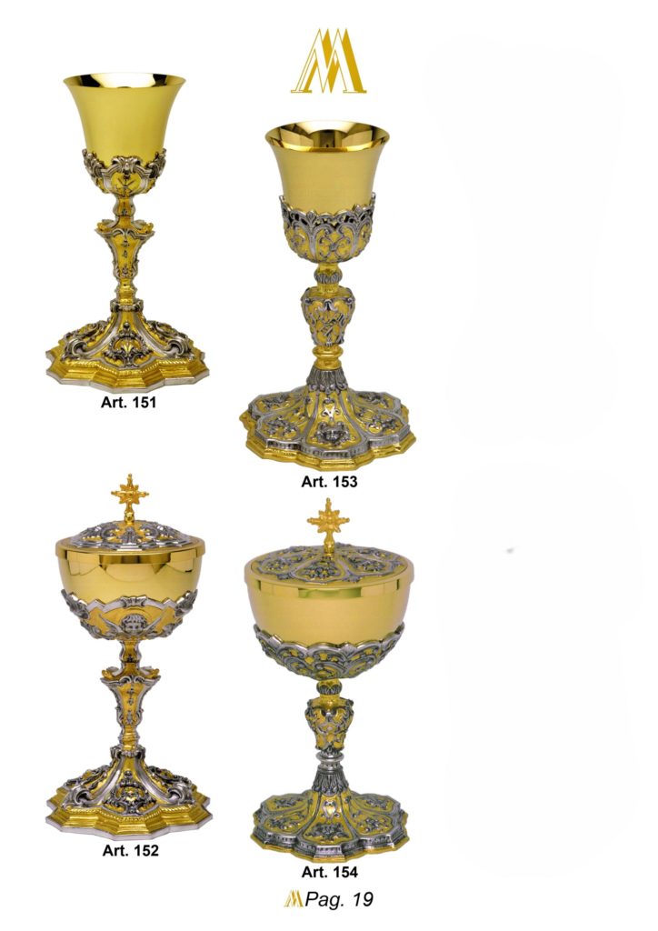 La nostra linea di calici per la Comunione offre al cliente l’opportunità di scegliere tra diversi stili, dall’eleganza di una forma semplice e sobria, alla preziosità del disegno a cesello e pietre preziose.